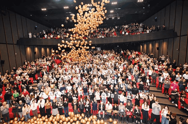 “Aydınlıkevler” oyununun bitiminde salona balonlar yağdı ve gece görsel olarak da unutulmaz bir ana dönüştü.