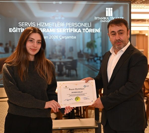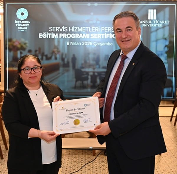 İstanbul Ticaret Odası 17 No.lu Restoran ve Yiyecek İçecek Hizmetleri Meslek Komitesi’nin öncülüğünde, İstanbul Ticaret Odası ve İstanbul Ticaret Üniversitesi Sürekli Eğitim Merkezi iş birliğinde hayata geçirilen “Servis Hizmetleri ve Barista Eğitim Programı” kapsamında düzenlenen sertifika töreni geniş bir katılımla gerçekleştirildi. Toplamda üç farklı başlıkta kurgulanan ve ücretsiz olarak sunulan eğitim programını başarıyla tamamlayan 52 kursiyere, İstanbul Ticaret Üniversitesi Eminönü Ahi Çelebi Kampüsü’nde düzenlenen törende sertifikaları verildi.